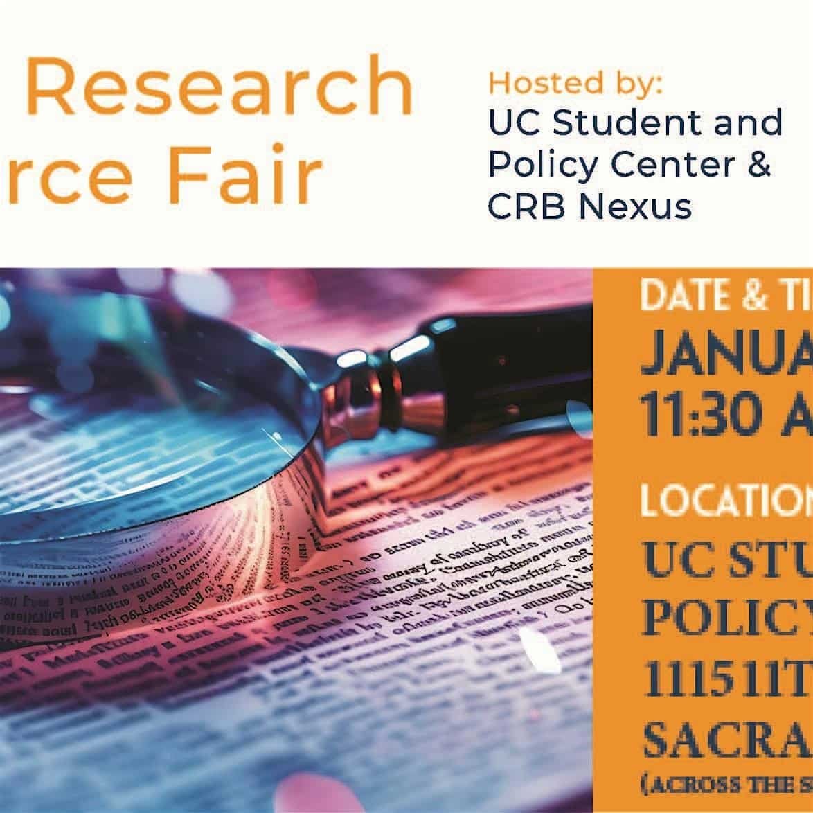 Government staff who research and draft legislation are invited to this lunchtime research resources fair co-hosted by the UC Student and Policy Center and the California Research Bureau Nexus.