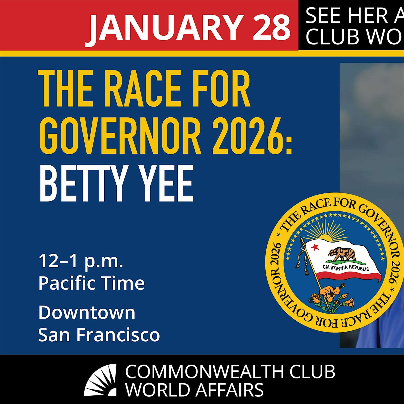 Yee joins Commonwealth Club World Affairs as part of our “Race for Governor 2026” series of candidate forums. Come meet the candidate, hear her vision for California, and ask your questions before you cast your vote for California’s next Governor.