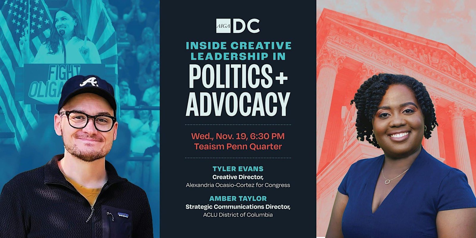 Go behind the scenes with ACLU DC + AOC for Congress on how in-house design drives political and advocacy change.Join AIGA DC for an intimate conversation with Amber Taylor, Strategic Communications Director at ACLU District of Columbia, and Tyler Evans, Creative Director for Alexandria Ocasio-Cortez for Congress. Together, they’ll share what it means to lead […]