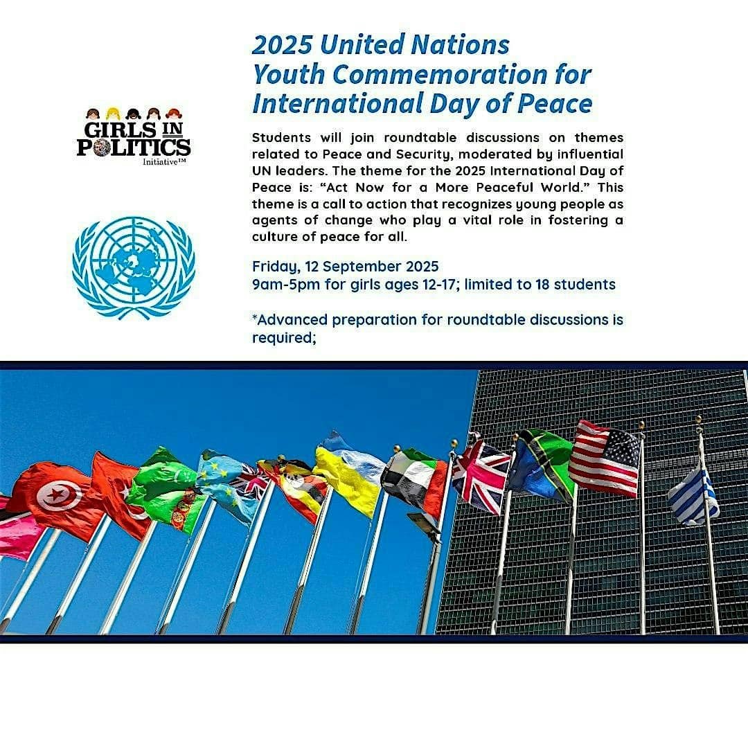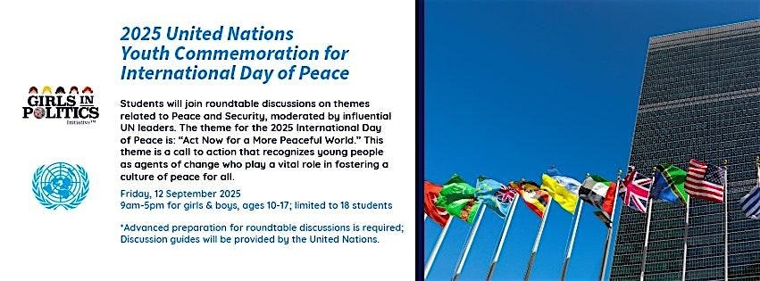 Girls AND boy join us for the 2025 Youth Commemoration for International Day of Peace in New York City at United Nations Headquarters!Event description:The United Nation's annual youth commemoration of the International Day of Peace will be held at United Nations Headquarters on Friday, 12 September 2025, from 9:00 a.m. to 12:00 p.m.The theme for […]
