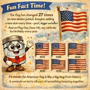 PJ thinks the American flag is like a big hug from history – it reminds us we’re all part of something amazing together. Next time you see it waving, give it a little wave back and feel proud!
